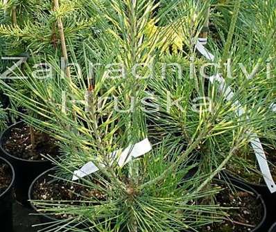 Pinus densiflora ´Oculus Draconis´ - nápadná je díky svým dikobrazím jehlicím, jež jsou 8-12 cm dlouhé a krémově až žlutavě pruhované. Roste nepravidelně, zejména do šířky. Přirozeně roste jako rozkladitý keř, takže chcete-li pěkný stromeček s rovným terminálem, musíte ji zamlada vyvázat a trochu jí vymodelovat tvar. Šišky jsou modrozelené a poměrně hojné.
